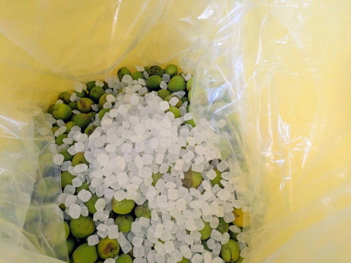 圭子さんと調理場の高嶋さんとで大きな樽に梅を入れて氷砂糖を入れてホワイトリカーを入れてと。