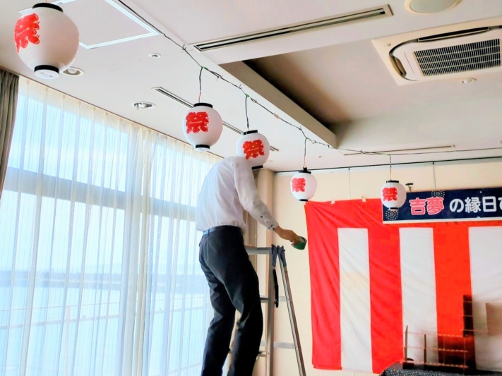 中村次長が頑張って『吉夢縁日ひろば』の設営をしております。