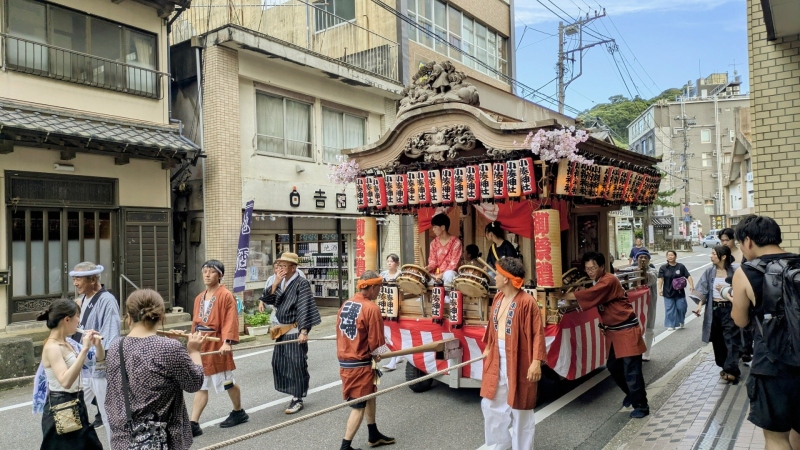 当館の前を♪ピーヒャラ、ドンドン♪山車が通過していきました。