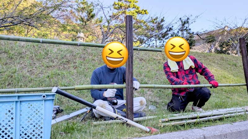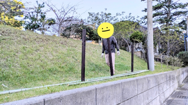 誕生寺の御上人、法衣から作業服に着替えて柵の修理をされていました。