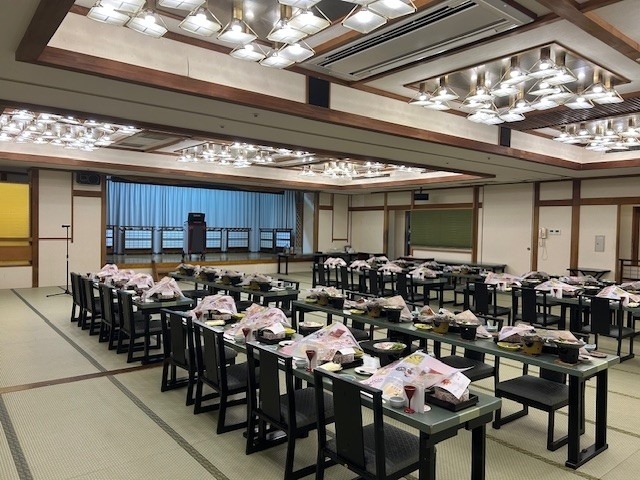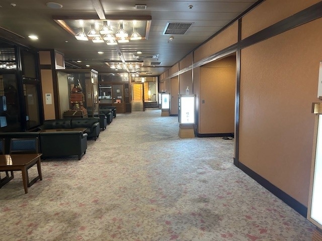 行灯の灯りが、宴会場の前の廊下を、明るく照らし、