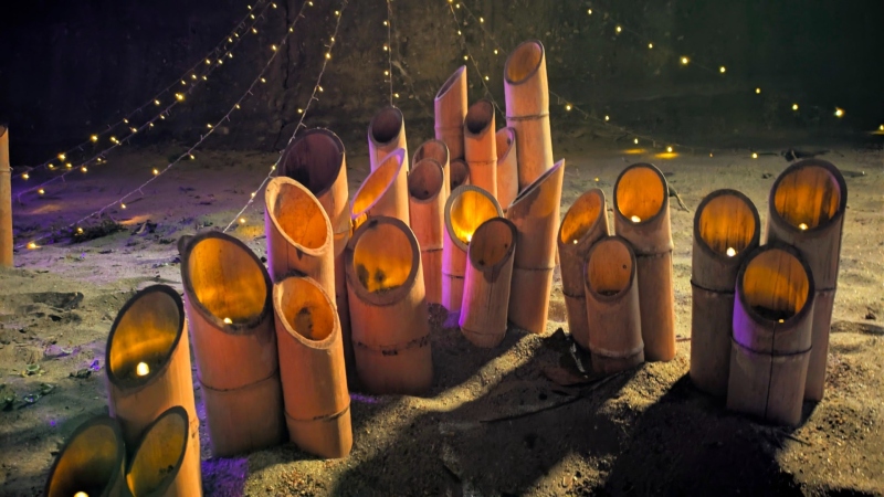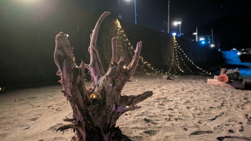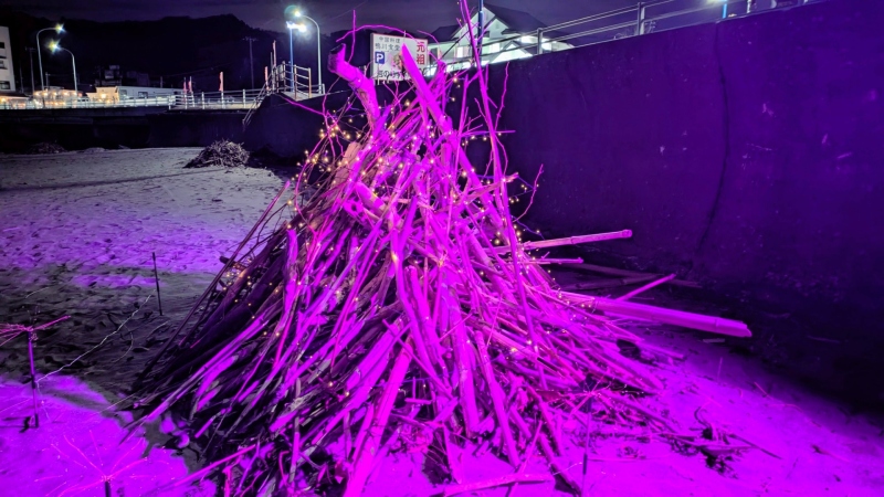 海岸清掃で集められた流木などに電飾を施してライトアップしております。