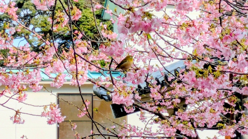 メジロがたくさんやって来ており、飛び立つときには桜の花びらがひらひらと舞い落ちます。