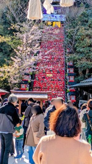 一番は遠見岬神社の石階段のおひな様は、やっぱり人気で見学するのに長蛇の列。