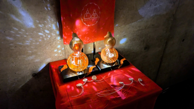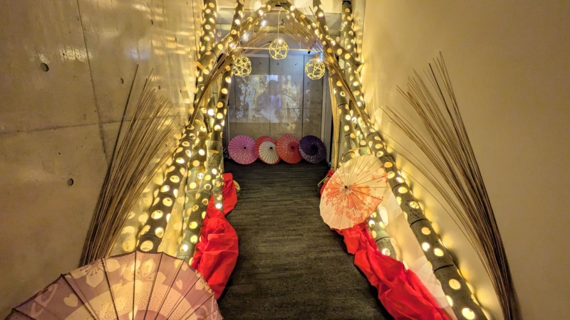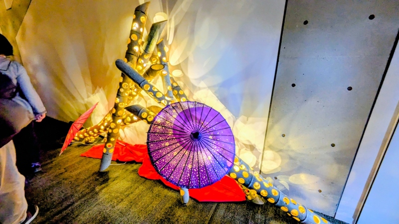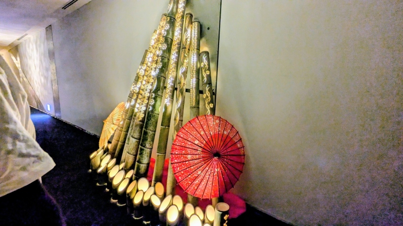 また館内順路を進んでいくと、暗くしてあるゾーンが出現して、竹と和傘でキレイにライトアップされていました。