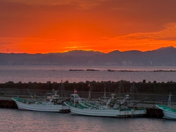 今日も空は真っ赤でした。名カメラマンさん撮影です。名カメラマンさん、いつもありがとうございます。ぜひロビーにて、温かいビワの葉茶をお召し上がりいただきながら、夕日そしてマジックアワーをお楽しみ下さいませ。