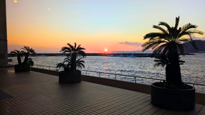 本日も、キレイな夕日でございました。しかし風が強かったのでロビーから撮影。ガラス越しの夕日でございます。しばらく雨予報がないので、お越しになられるお客様に夕日をお楽しみいただけるかと思います。
