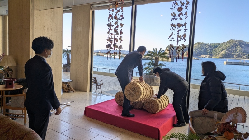今年も残すところ、あと30時間くらいでございます。本日搗いたお餅でからみ餅を作って持って来て下さった方がおりまして、今晩いただこうと思っております。お餅と言えば、令和8年一発目のイベントといたしまして、例年通り1Fロビーにてお餅つきを朝から3回行います。搗きたてのお餅は、あんこ・きなこ・当館特製からみ餅でお召し上がりいただけます。※宿泊者限定また午後からは3Fにて初釜のお茶会サービスが行われます。※宿泊者限定海をご覧になられながら頂く抹茶は最高かと・・・。またお茶の先生がご用意して下さる抹茶が、いつも美味でございますぅ~。正座しなくては頂けないのかしら?と、心配される方もいらっしゃるかもしれませんが、ご安心して下さい。椅子にお掛け頂いてお召し上がりいただけます。是非、この機会に非日常をお楽しみ下さいませ。